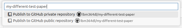 - Search the command “Publish to GitHub”. You will see some default options, but you can also choose your own name.