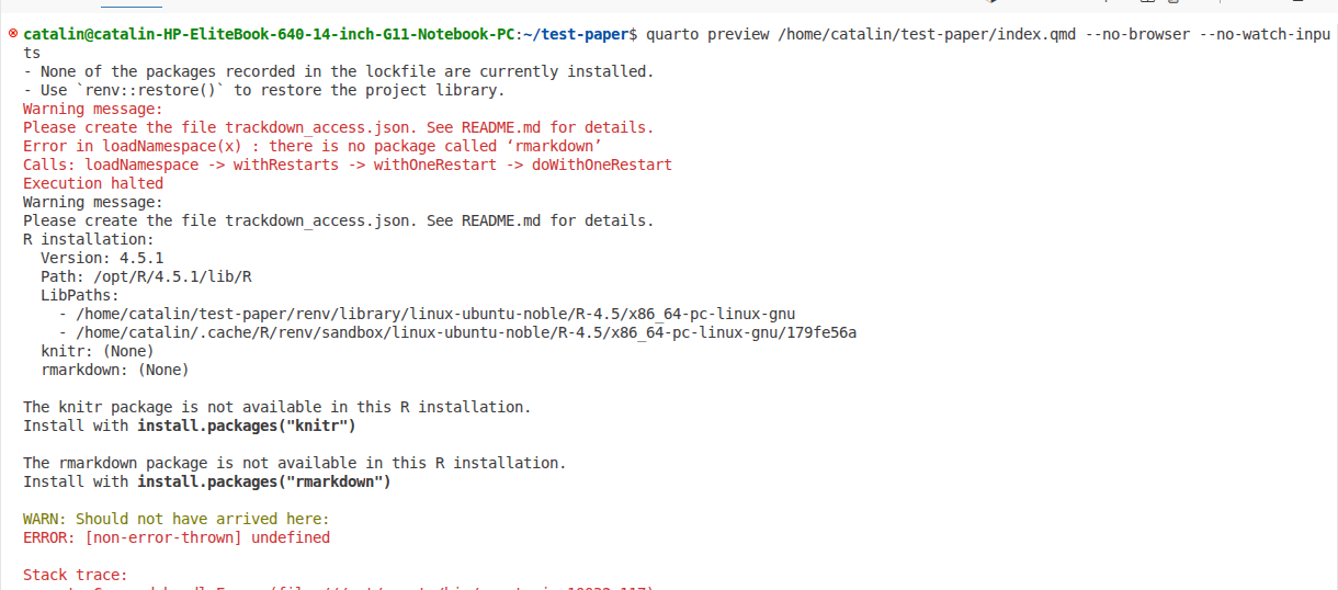 - Useful messages saying we didn’t install packages such as knitr and rmarkdown. You might know how to solve that, but wait.