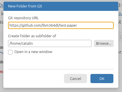 Come on, search for the command New Folder from Git, just as I told you in the previous section. You can copy URLs of GitHub repositories directly. I created an example for you. It’s at https://github.com/lbm364dl/test-paper. You can pay a visit if you’re interested or just copy and paste the URL: