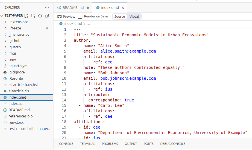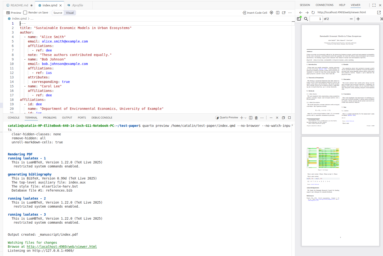 And that’s it. You produced your PDF paper! Under the hood, your Quarto file index.qmd is being converted to a LaTeX file, and the PDF output is created from that LaTeX file. The magic is you don’t need to write ugly LaTeX. Quarto does that for you. It also knows how to convert your file to dozens of other formats.