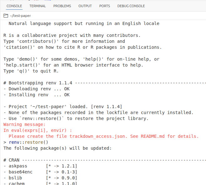 What is this renv::restore() thing? Just a simple command that will install all R packages required to run some code in the project. So you don’t need to install each package by hand, just run this command in the console: