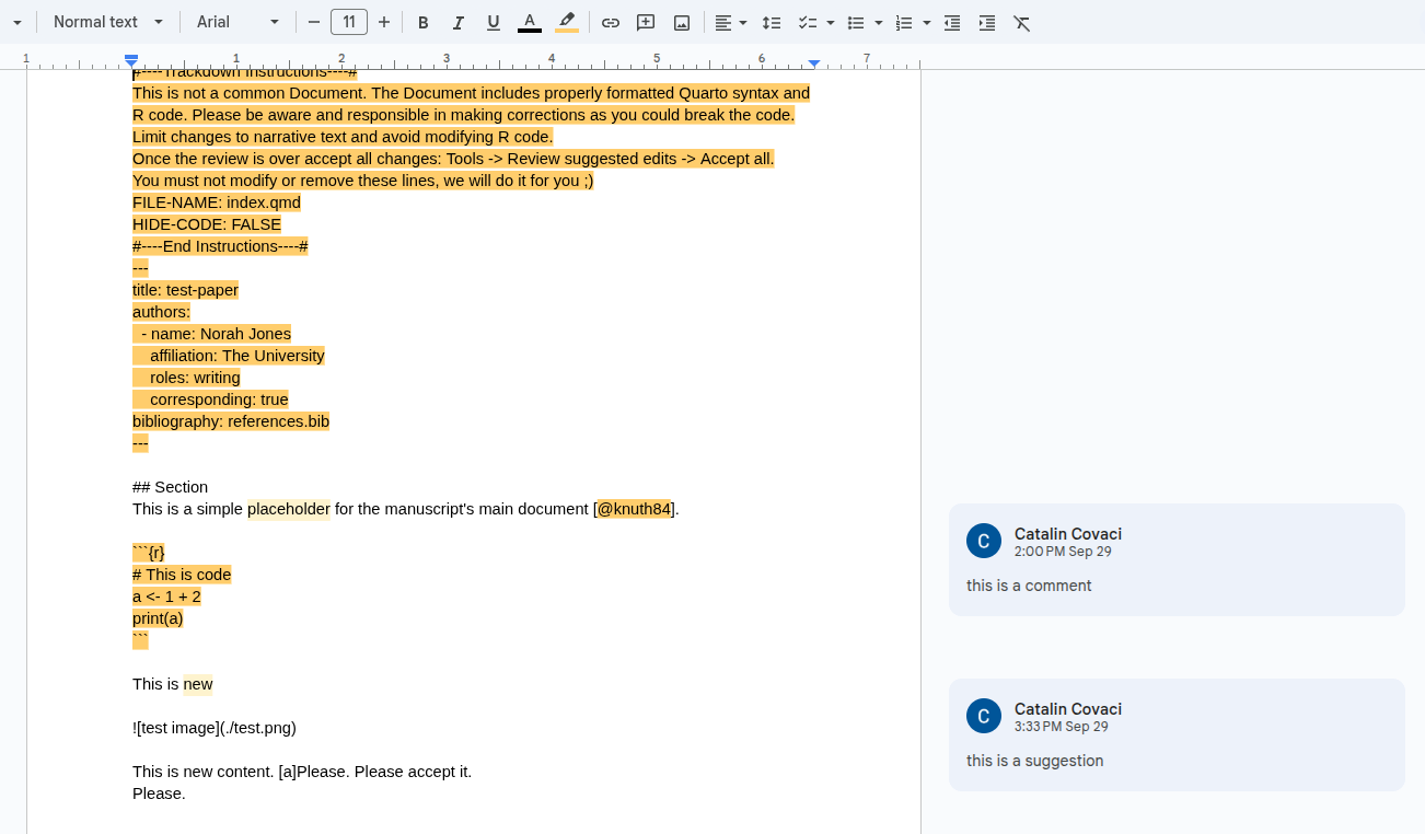 trackdown::upload_file("path/to/file.qmd")(if first time upload) ortrackdown::update_file("path/to/file.qmd")(if Google Docs file already existed). You ask for feedback. - You’re done with feedback.